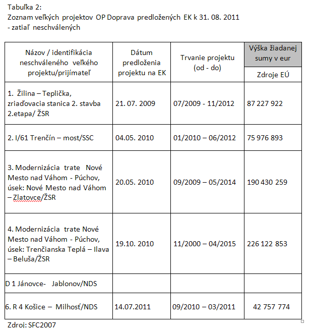Na konci septembra 2010 bolo zazmluvnenie (kontrahovanie) na projekty v rámci Operačného programu Doprava (OPD) na úrovni 32,63 percent z celkovej čiastky, čo predstavovalo 1,254 miliardy eur. Ku koncu septembra 2011 ministerstvo dopravy eviduje zazmluvnenie vo výške 53,46 percent z celkovej sumy, čo predstavuje nárast kontrahovania o takmer 353 miliónov eur. Významný nárast v kontrahovaní dopravných infraštruktúrnych projektov – o vyše 12 percent – nastal za posledných päť mesiacov, keď boli zazmluvnené tieto veľké projekty (t.j. projekty nad 50 mil. eur): diaľnica D1 Jánovce – Jablonov, R1 Košice-Milhosť a cestný most v Trenčíne. V najbližšom období budú zazmluvnené tri veľké projekty: výstavba úsekov D1 Dubná Skala – Turany, Fričovce – Svinia, terminál intermodálnej prepravy v Žiline a z projektov s nákladmi do 50 mil. eur to budú projekty výstavby mimoúrovňovej križovatky vo Zvolene, štvorpruhový prieťah Prešovom, výstavba pruhu pre pomalé vozidlá v Dolnom Kubíne, mestský obchvat v Čadci, sanácia cesty Veľký Krtíš – Pôtor, eliminácia bezpečnostných rizík na cestách 1.triedy a modernizácia mostov na cestách 1.triedy.